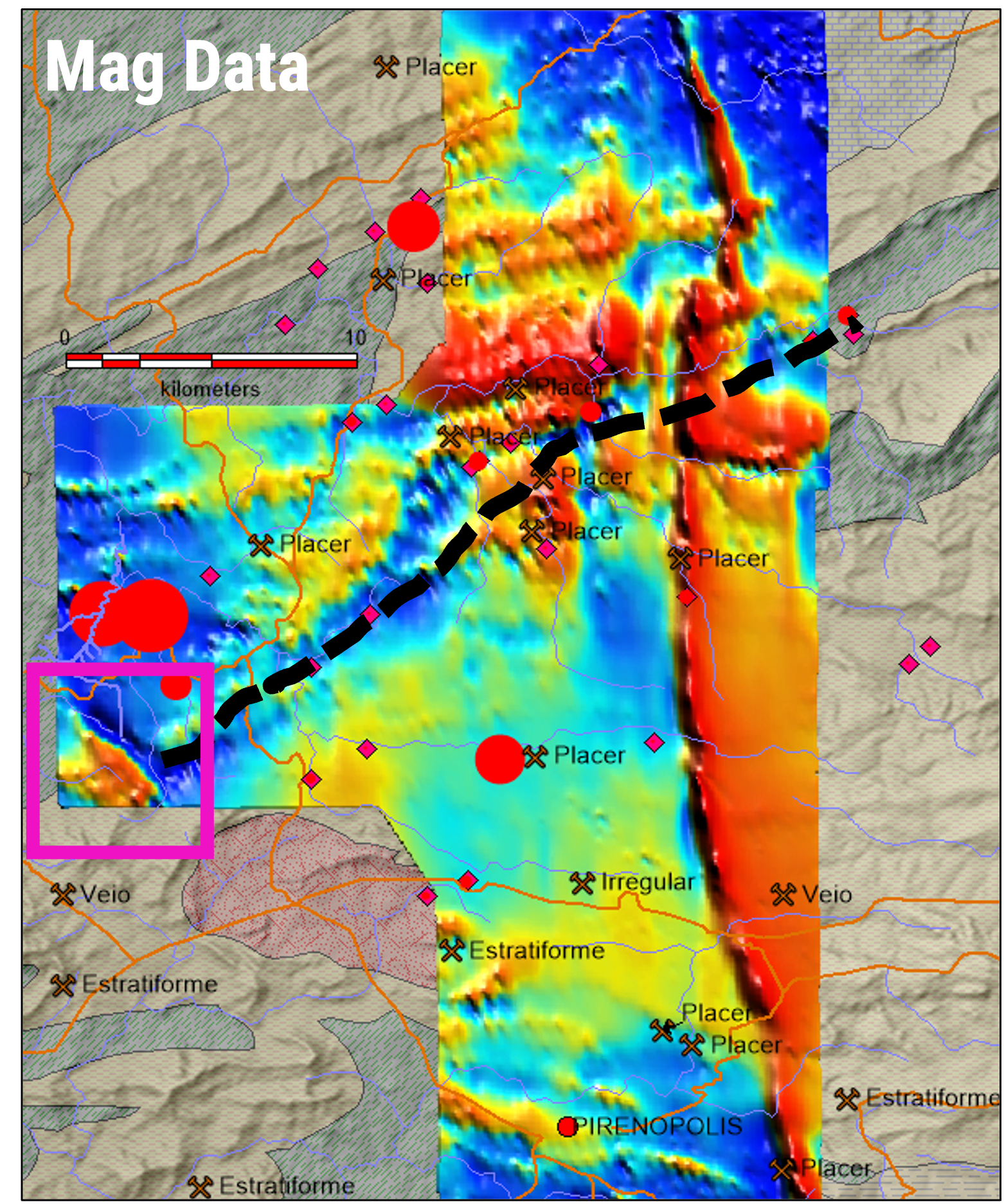 A regional linear trend in the government airborne magnetics (black dash line) is interpreted as a district scale fault that could represent a conduit for mineralization.