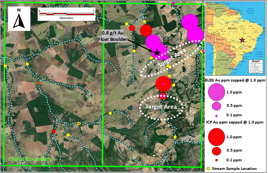 High-grade assay of 6.38 ppm gold (6.38 g/t Au), as well as four additional samples ranging from 1.64 ppm to 0.424 ppm gold in the 2 streams.